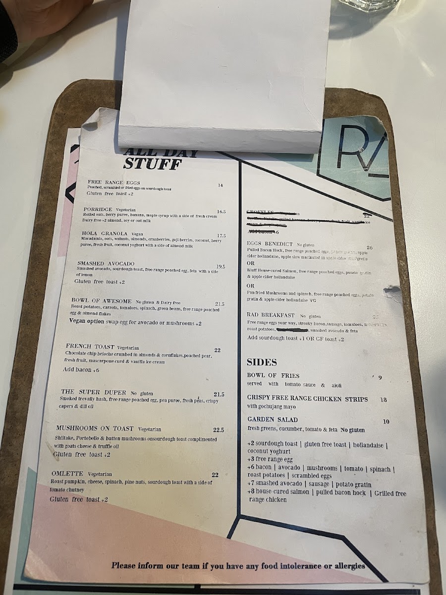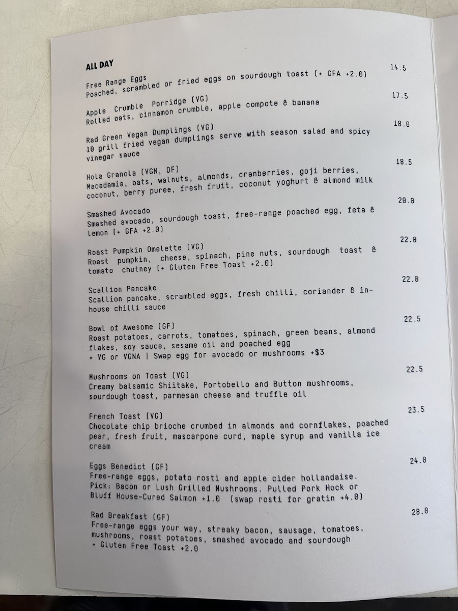 The menu at RAD Cafe offers a carefully curated selection of simple yet satisfying dishes and drinks, perfect for a relaxed breakfast or a casual catch-up over coffee. The focus is on approachable, comforting food with a touch of local and international inspiration, served throughout the day.